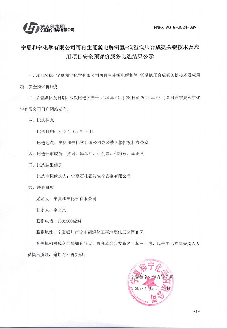 可再生能源電解制氫-低溫低壓合成氨關鍵技術及應用項目安全預評價委外服務工作比選結果公示