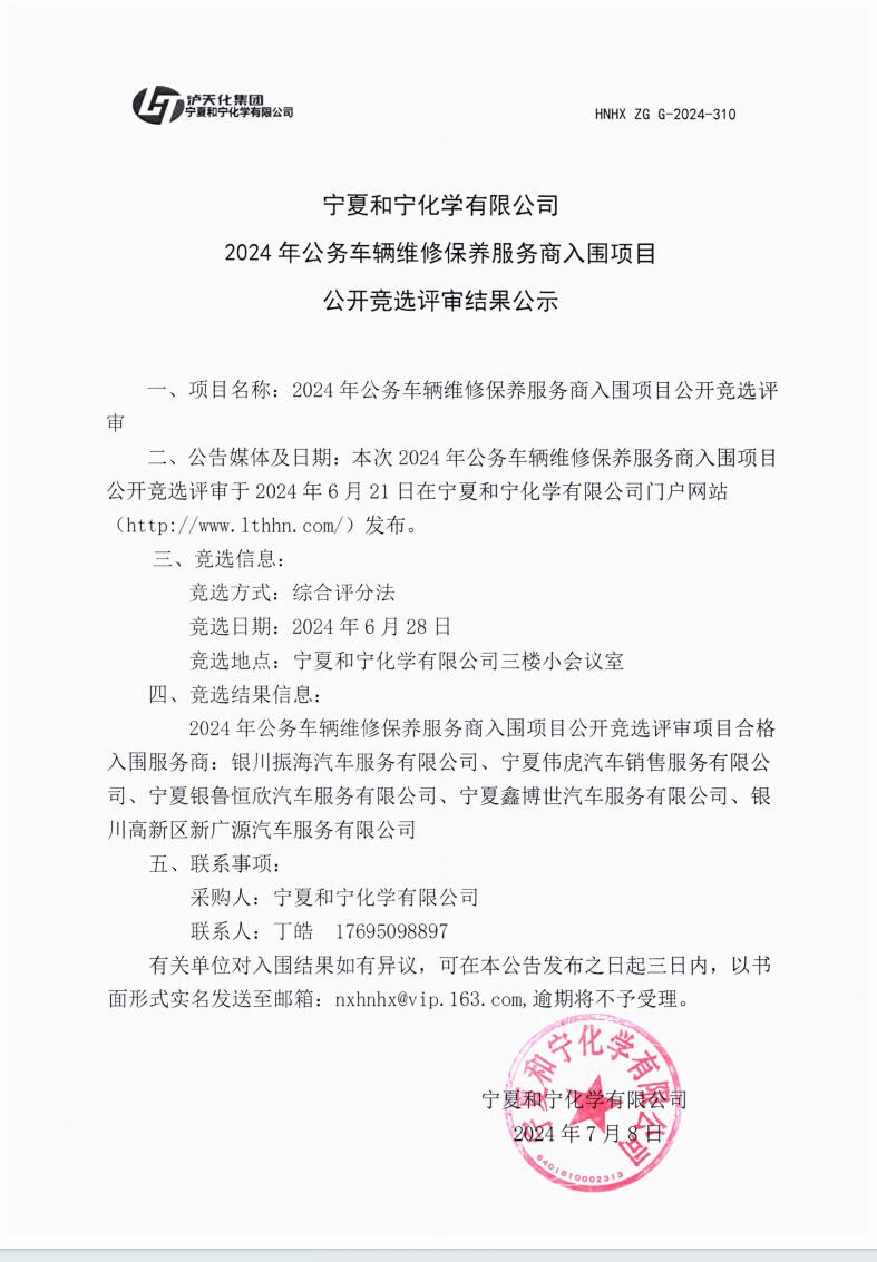 寧夏和寧化學(xué)有限公司2024年公務(wù)車輛維修保養(yǎng)服務(wù)商入圍項(xiàng)目公開競(jìng)選評(píng)審結(jié)果公示