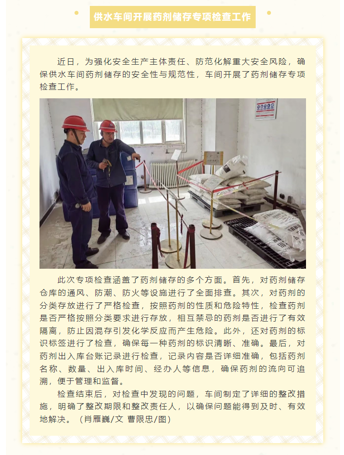供水車間開(kāi)展藥劑儲(chǔ)存專項(xiàng)檢查工作