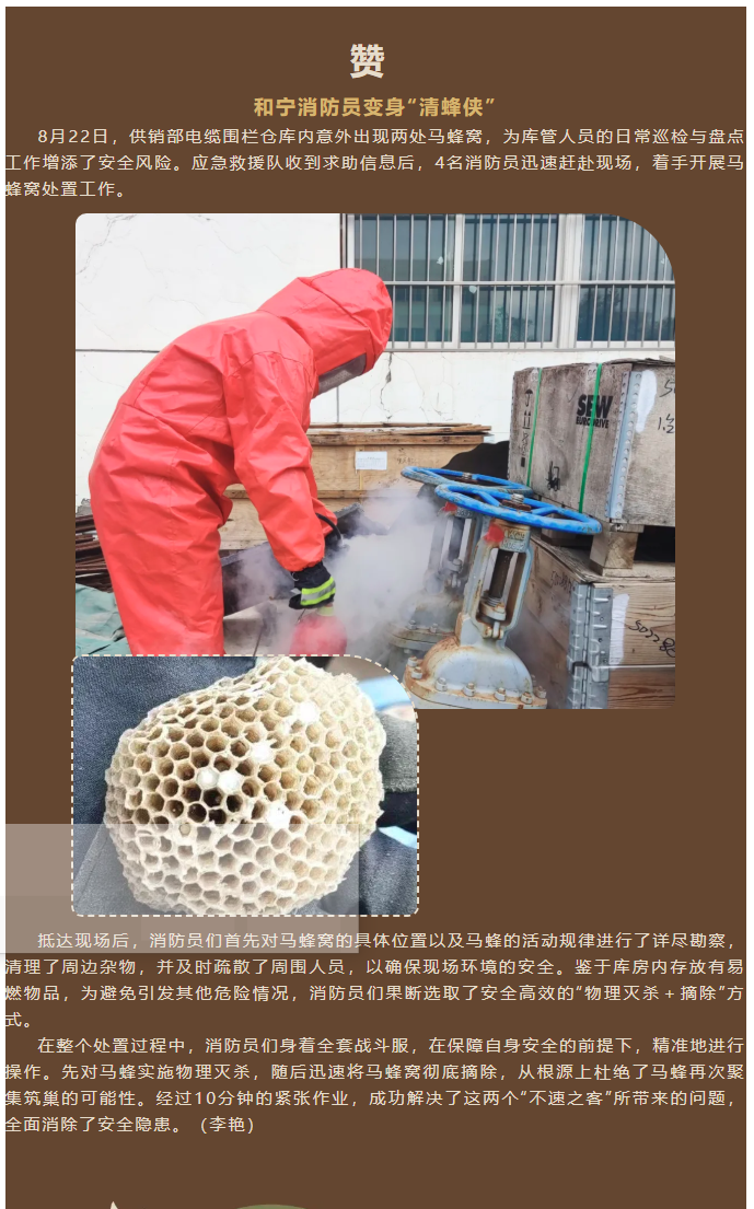 他力量丨贊!和寧消防員變身“清蜂俠”