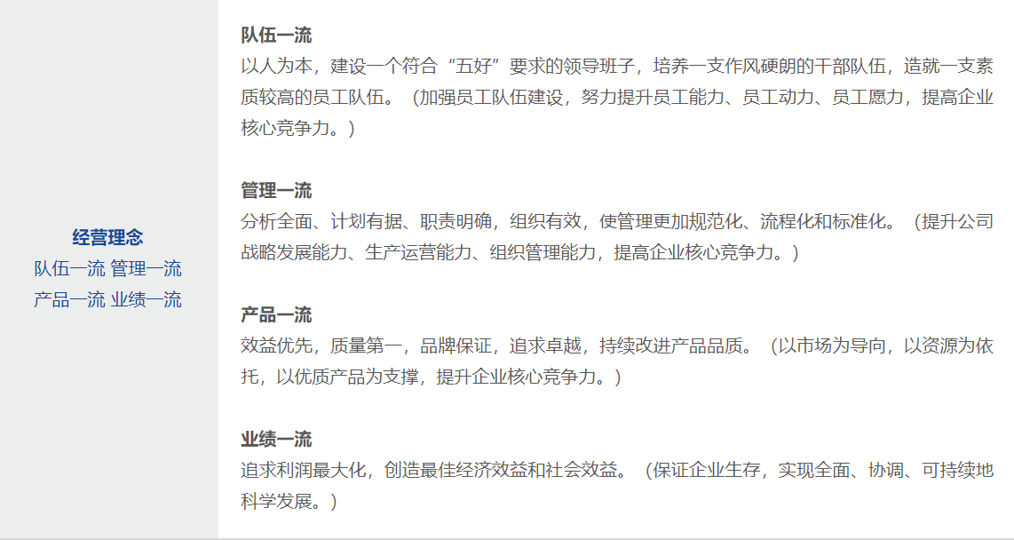 經(jīng)營(yíng)理念 隊(duì)伍一流 管理一流 產(chǎn)品一流 業(yè)績(jī)一流
