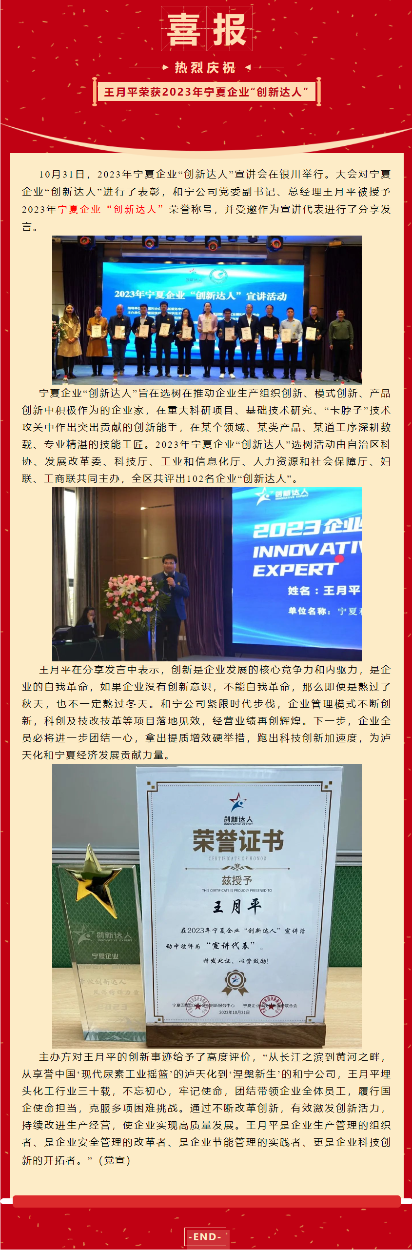 喜報!王月平榮獲2023年寧夏企業“創新達人”