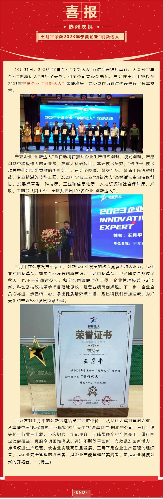 熱烈慶祝王月平榮獲2023年寧夏企業(yè)“創(chuàng)新達(dá)人”