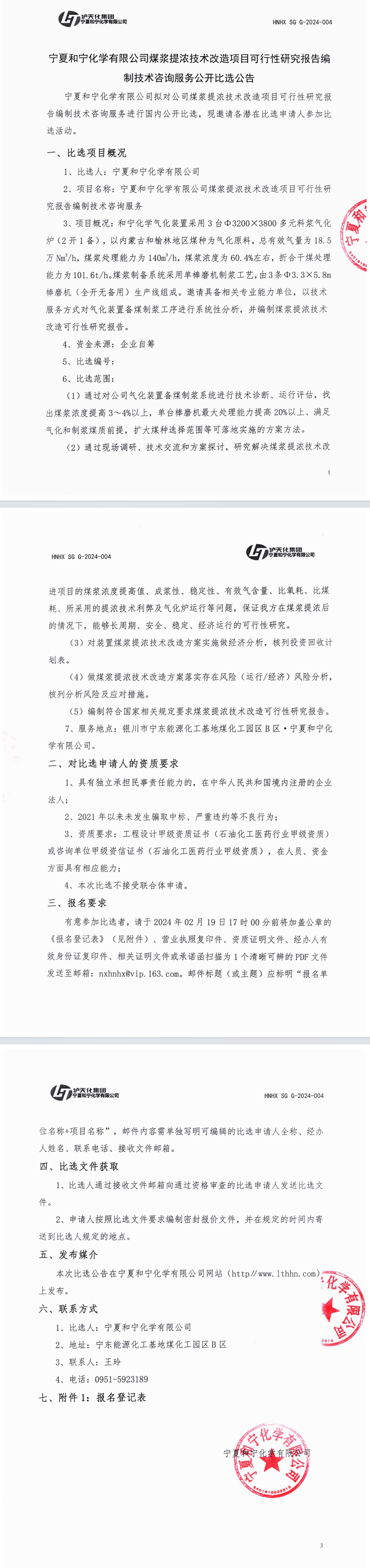 寧夏和寧化學有限公司煤漿提濃技術改造項目可行性研究報告編制技術咨詢服務公開比選公告附件